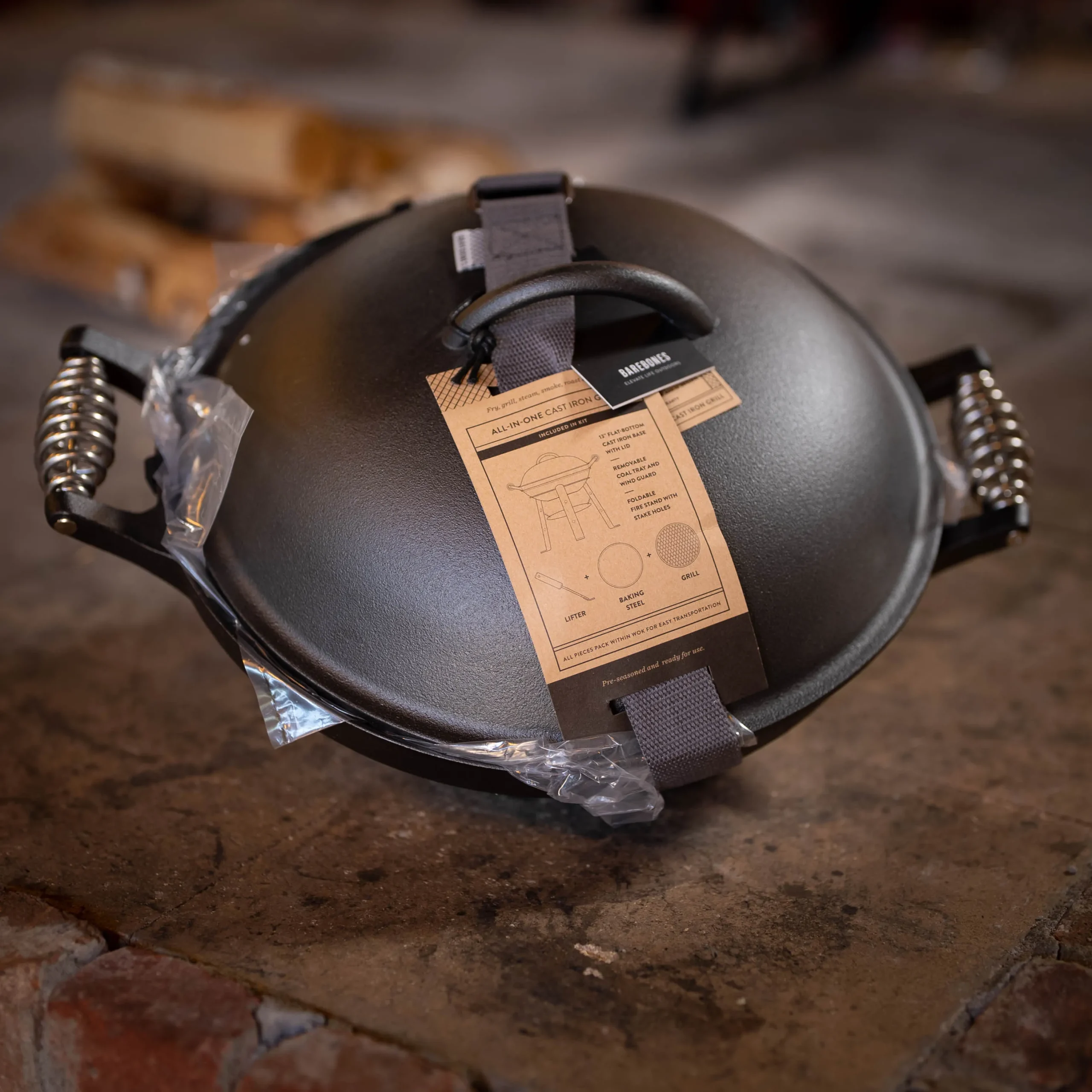 Voor in de keuken, in de tuin, boven open vuur en te stoken met kolen.– 13”/33 cm gietijzeren wok/oven met platte bodem en een deksel.